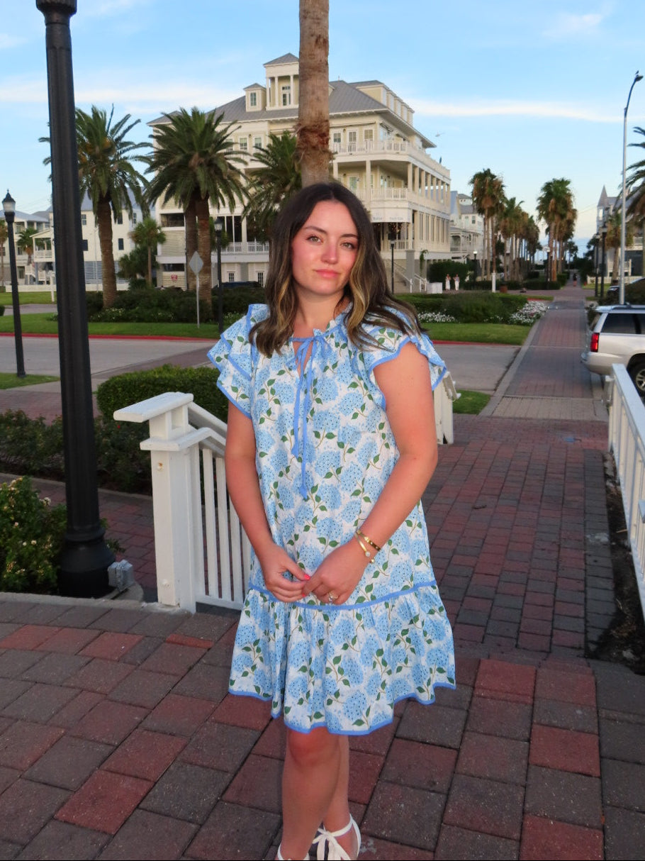 Step into summer with the ultimate coastal charm in our Hydrangea Haze Mini Dress. Featuring a cheerful blue floral print of delicate hydrangeas on a soft, breathable fabric, this dress is perfect for seaside strolls and sunny getaways. The flutter sleeves add a playful touch, while the dainty bow tie at the neckline brings a hint of sweetness and femininity. With its relaxed midi length and floaty silhouette, it’s made for twirling under palm trees, savoring sunset dinners, and soaking in every carefree, sun-kissed moment.