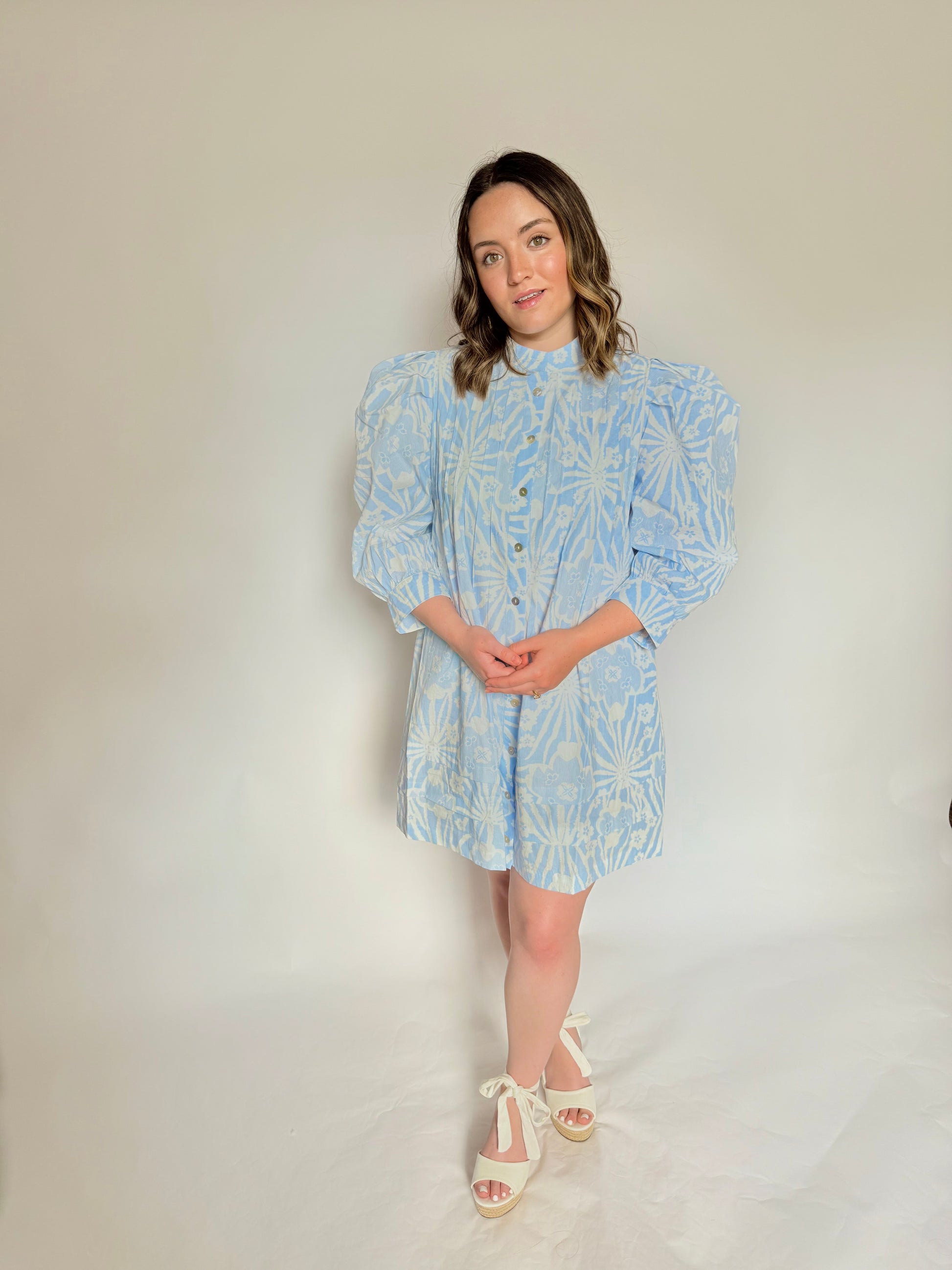 Meet your new warm-weather favorite: this blue floral pintuck mini dress is the perfect blend of playful and polished. Designed with soft pintuck detailing, statement puff sleeves, and a full front button-down closure, it offers both charm and versatility. The light blue floral print adds a fresh, airy feel that's ideal for spring and summer days. This dress can easily be dressed up or down for any occasion!
