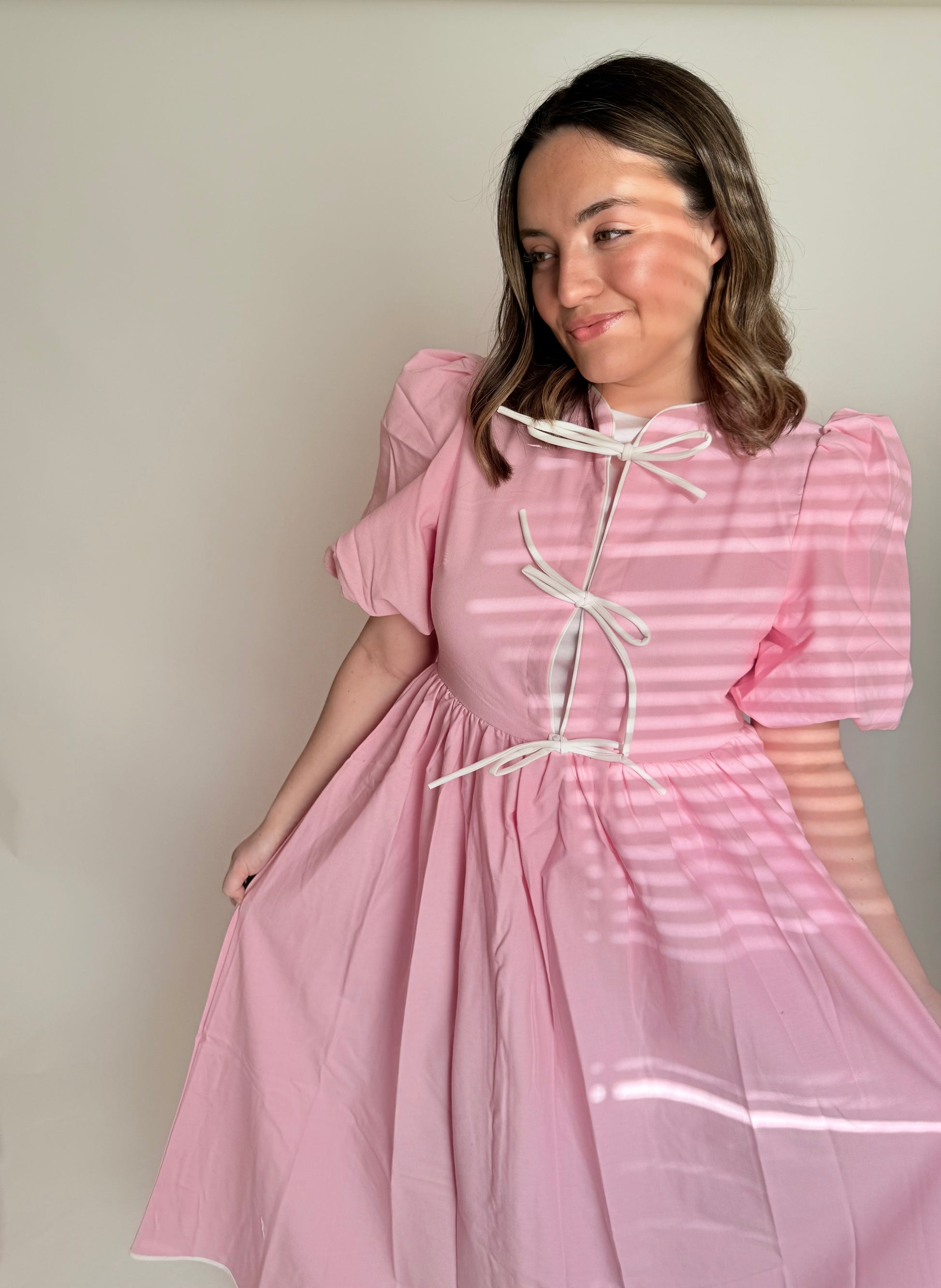 This dress is the epitome of feminine charm and timeless elegance. The soft, light pink hue gives it a dreamy, feminine feel, while the structured puff sleeves and gathered waist create a flattering silhouette. Delicate leather bow ties elevate the look with a touch of modern sophistication, making this dress perfect for everything from brunch dates to special occasions. (Undershirt not included)
